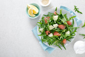Świeża sałatka warzywna wegetariańska z rzodkiewką, ogórkiem i rukolą, zdrowa żywność.