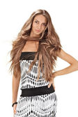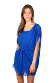 ładna panienka w portret niebieski frędzlami studio sukienka słońce na białym