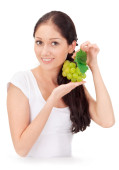 Młoda atrakcyjna kobieta z zielonych winogron klastra na białym tle