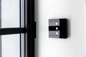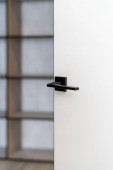 Przycięte ujęcie białych drzwi z czarnym matowym uchwytem i blokadą bezpieczeństwa wykonane w minimalistycznym stylu w domu lub w pokoju hotelowym