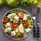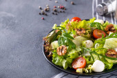 Dietetyczna i zdrowa sałatka z pomidorami, serem mozzarella, rukolą i orzechami włoskimi