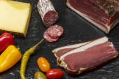 Przystawki mięsne z marynowanymi warzywami na drewnianej desce. Widok z góry, przestrzeń kopiowania