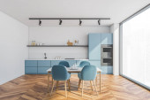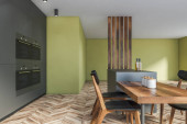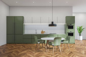 Stylowe wnętrze jadalni z szarymi i żółtymi ścianami, drewniana podłoga, długi stół z żółtymi krzesłami i szarymi licznikami z wbudowanymi urządzeniami. Ułóż plakat. 3d renderowanie