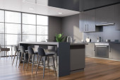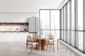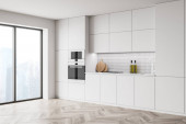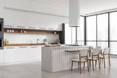 Zdjęcie "Narożnik stylowej kuchni z białymi ścianami, drewnianą podłogą, wygodnym drewnianym barem i szafkami. Zamazane okno miejskie. 3d renderowanie" może być wykorzystywane do celów osobistych i komercyjnych zgodnie z warunkami zakupionej licencji Royalty-free. Obraz jest dostępny do pobrania w jakości wysokiej rozdzielczości do 5760x3840.