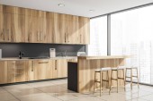 Narożnik stylowej kuchni z białymi ścianami, drewnianą podłogą, wygodnym drewnianym barem i szafkami. Zamazane okno miejskie. 3d renderowanie