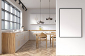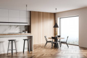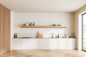 Zdjęcie "Beżowy pokój kuchenny ze stołem i trzema krzesłami, widok z przodu, parkiet. Wnętrze zestawu kuchennego z półką i stojakiem, okno ze wsi. Kopiuj przestrzeń płótno ramki, 3D renderowania nie osób" może być wykorzystywane do celów osobistych i komercyjnych zgodnie z warunkami zakupionej licencji Royalty-free. Obraz jest dostępny do pobrania w jakości wysokiej rozdzielczości do 5760x3840.
