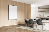 Beżowy pokój kuchenny ze stołem i trzema krzesłami, widok z przodu, parkiet. Wnętrze zestawu kuchennego z półką i stojakiem, okno ze wsi. Kopiuj przestrzeń płótno ramki, 3D renderowania nie osób