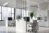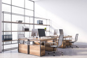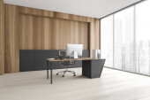 Zdjęcie "Narożnik luksusowego skandynawskiego stylu CEO biura z kamienia i drewnianych ścian, biurko komputerowe i dwie biblioteczki. Panoramiczne okno z zamazanym krajobrazem miasta. 3d renderowanie" może być wykorzystywane do celów osobistych i komercyjnych zgodnie z warunkami zakupionej licencji Royalty-free. Obraz jest dostępny do pobrania w jakości wysokiej rozdzielczości do 5760x3840.