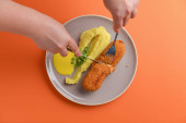 dziewczyna kroi omlet nożem, śniadanie w talerzu, sałatkę i jajko, ogórki i pomidory