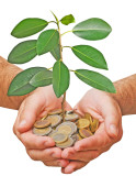 ręce ochrony drzewa rosnące z stos monet