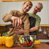 Selektywne skupienie się na sałatce gotowanej przez pary homoseksualne