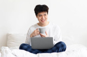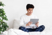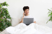Zdjęcie "Pilna praca w sypialni, gadżety w domu, bezpiecznej i społecznej odległości" może być wykorzystywane do celów osobistych i komercyjnych zgodnie z warunkami zakupionej licencji Royalty-free. Obraz jest dostępny do pobrania w jakości wysokiej rozdzielczości do 5760x3840.