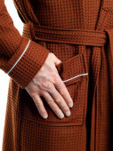 kobieta w jasnym szlafroku reklamuje szczegóły odzieży na białym tle. Zrobione w studiu z bliska.