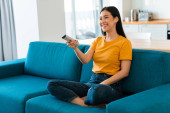 Zdjęcie "Domowe rozrywki. Szczęśliwy czarny lady z pilotem wyszukiwania filmu w telewizji, siedzi na kanapie z okularami VR w pobliżu" może być wykorzystywane do celów osobistych i komercyjnych zgodnie z warunkami zakupionej licencji Royalty-free. Obraz jest dostępny do pobrania w jakości wysokiej rozdzielczości do 5760x3840.