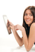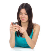 ładna kobieta, czytanie, pisanie i wysyłanie wiadomości tekstowej sms na zdejmowany telefon uśmiechający się i śmiejąc się na białym tle na białym tle