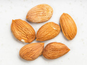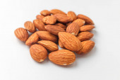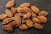 górny widok stosu surowych nasion migdałów zbliżyć na szarej płycie ceramicznej