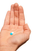 młoda kobieta lekarz oferuje kapsułki pigułki, czerwony i niebieski dla pacjenta w ręku na białym tle na białym tle