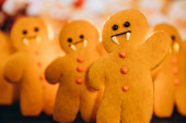 Halloween Pierniki Ciasteczka na czarnym tle, selektywne skupienie i puste miejsce. kreatywne tło Halloween