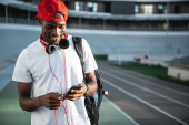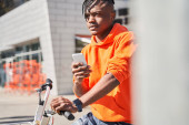 Dostawca noszący kask rowerowy i plecak dostawczy za pomocą smartfona