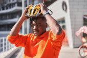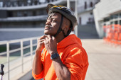 Zdjęcie "Dostawca noszący kask rowerowy i plecak dostawczy za pomocą smartfona" może być wykorzystywane do celów osobistych i komercyjnych zgodnie z warunkami zakupionej licencji Royalty-free. Obraz jest dostępny do pobrania w jakości wysokiej rozdzielczości do 5760x3840.