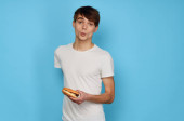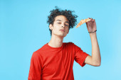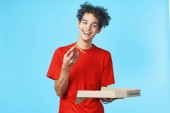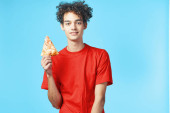 energiczny facet z kawałkiem pizzy bawiący się na niebieskim tle i czerwonym t-shircie
