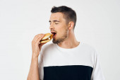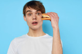 Zdjęcie "energiczny facet z kawałkiem pizzy bawiący się na niebieskim tle i czerwonym t-shircie" może być wykorzystywane do celów osobistych i komercyjnych zgodnie z warunkami zakupionej licencji Royalty-free. Obraz jest dostępny do pobrania w jakości wysokiej rozdzielczości do 5760x3840.