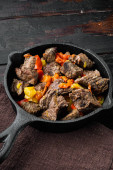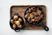 Fajitas mięso wołowe tradycyjne dania kuchni meksykańskiej na patelni. Białe tło. Widok góry. Przestrzeń kopiowania