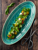 Purslane Sałatka z pomarańczą i quinoa na niebieskim tle kamienia.
