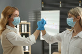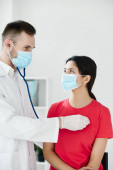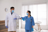 Lekarze w rękawiczkach medycznych z maskami ochronnymi podającymi uścisk dłoni w szpitalu