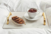 Aromatyczna kawa, herbatnik i piękny kwiat na łóżku z szarą pościelą wewnątrz