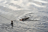 wędkowanie na rzece człowiek stawia przynętę na łowienie ryb, selektywne skupienie. Przyroda