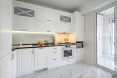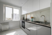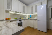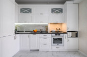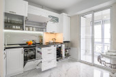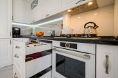 Zdjęcie "Luksusowe białe, nowoczesne wnętrze kuchni, wysuwane szuflady, otwarte drzwi zmywarki" może być wykorzystywane do celów osobistych i komercyjnych zgodnie z warunkami zakupionej licencji Royalty-free. Obraz jest dostępny do pobrania w jakości wysokiej rozdzielczości do 5760x3840.