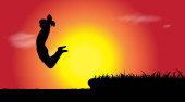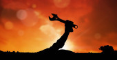 Kompozycja sylwetki artystki wojennej przeciwko pomarańczowemu niebu z zachodem słońca. koncepcja sportu i konkurencji generowana cyfrowo.