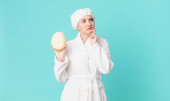 blondynka ładna kobieta wygląda szczęśliwy, zdumiony i zaskoczony i noszenie szlafrok