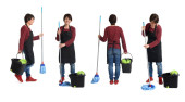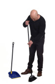 gospodyni domowa z miotłą i patelnią na białym tle