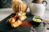 Zdjęcie "Bakłażan bułki z serem na kamiennej tablicy, widok z bliska " może być wykorzystywane do celów osobistych i komercyjnych zgodnie z warunkami zakupionej licencji Royalty-free. Obraz jest dostępny do pobrania w jakości wysokiej rozdzielczości do 5760x3840.
