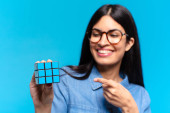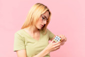 Gry blondynka ładna kobieta rozwiązywanie logiczne wyzwanie gry