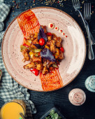 talerz z pysznym smażonym mięsem i pomidorami wiśniowymi z sosem śmietankowym i pietruszką z filiżanką herbaty i czajnikiem na stole, widok z góry