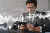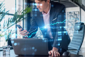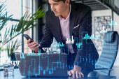 Biznesmen w garniturze za pomocą smartfona w celu optymalizacji strategii handlowej w korporacyjnym funduszu finansowym. Forex wykres hologram na nowoczesnym tle panoramicznym biura