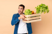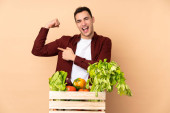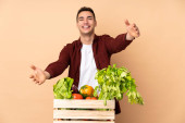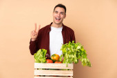 Rolnik ze świeżo zebranymi warzywami w pudełku odizolowanym na beżowym tle uśmiechnięty radosnym i przyjemnym wyrazem twarzy