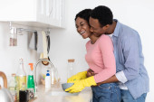 czarny facet przytula jego wesoły dziewczyna mycie naczynia w kuchnia