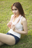 Zdjęcie "kobieta siedzi na trawniku trzymając tabletkę." może być wykorzystywane do celów osobistych i komercyjnych zgodnie z warunkami zakupionej licencji Royalty-free. Obraz jest dostępny do pobrania w jakości wysokiej rozdzielczości do 5760x3840.