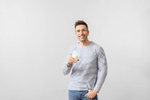 Przystojny młody człowiek biorąc pigułki na tle koloru