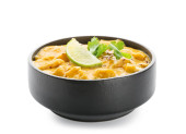 Patelnia smacznego kurczaka tikka masala na białym tle