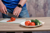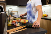 Blisko człowieka cięcia warzyw z nożem w jego mieszkaniu, koncepcja wegańska
