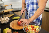 Zdjęcie "Blisko człowieka cięcia warzyw z nożem w jego mieszkaniu, koncepcja wegańska" może być wykorzystywane do celów osobistych i komercyjnych zgodnie z warunkami zakupionej licencji Royalty-free. Obraz jest dostępny do pobrania w jakości wysokiej rozdzielczości do 5760x3840.