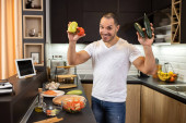 Zdjęcie "Blisko człowieka cięcia warzyw z nożem w jego mieszkaniu, koncepcja wegańska" może być wykorzystywane do celów osobistych i komercyjnych zgodnie z warunkami zakupionej licencji Royalty-free. Obraz jest dostępny do pobrania w jakości wysokiej rozdzielczości do 5760x3840.