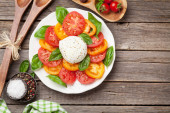 Zdjęcie "Sałatka z serem burrata i pomidorami z miejsca powyżej" może być wykorzystywane do celów osobistych i komercyjnych zgodnie z warunkami zakupionej licencji Royalty-free. Obraz jest dostępny do pobrania w jakości wysokiej rozdzielczości do 5760x3840.