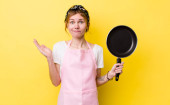 Zdjęcie "młoda ładna kobieta uśmiecha się pewnie wskazując na własny szeroki uśmiech szefa kuchni i trzymając patelnię" może być wykorzystywane do celów osobistych i komercyjnych zgodnie z warunkami zakupionej licencji Royalty-free. Obraz jest dostępny do pobrania w jakości wysokiej rozdzielczości do 5760x3840.