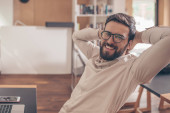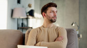 Młody mężczyzna relaksuje się na kanapie w spokojnej atmosferze sam